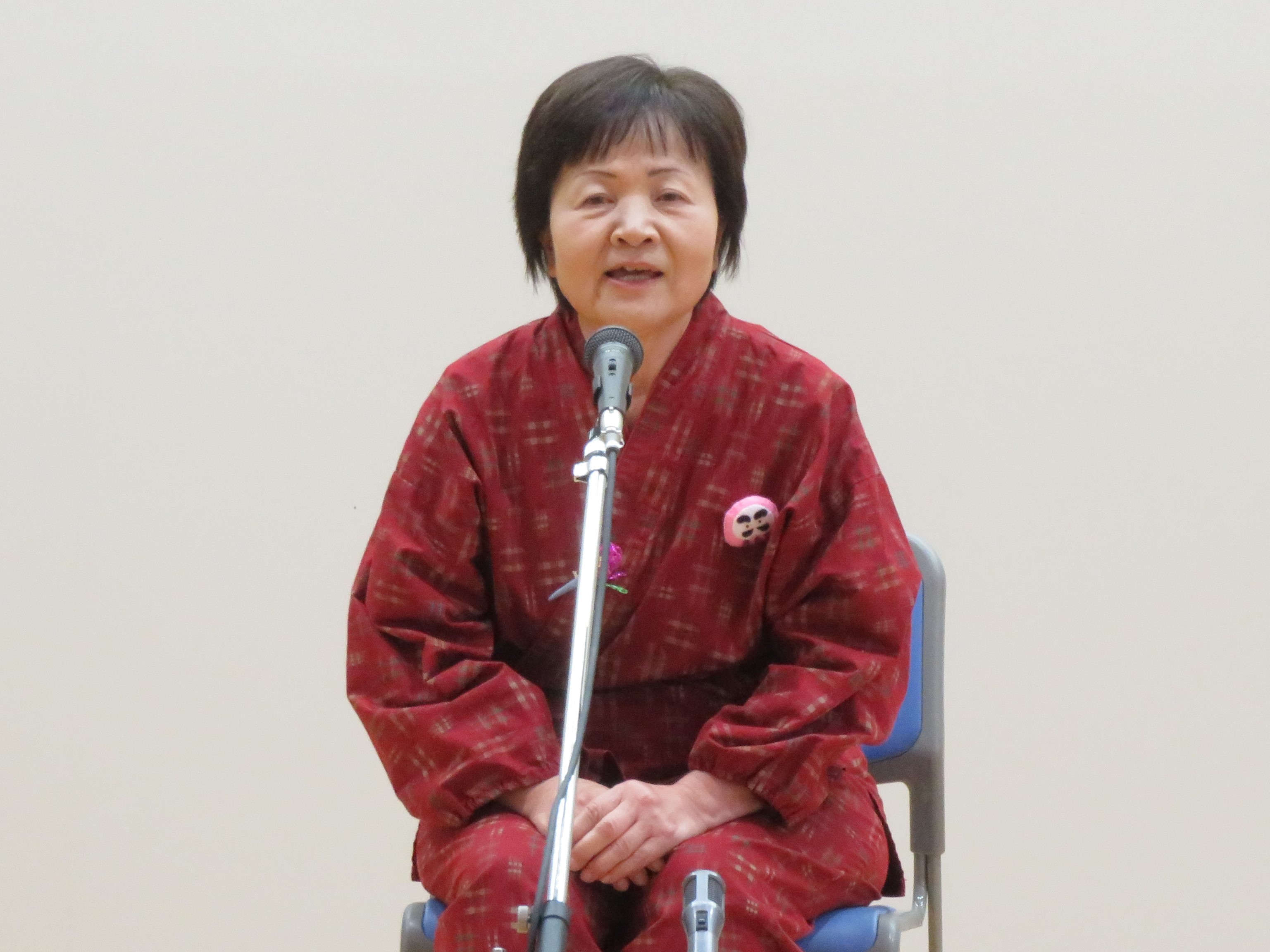 民話塾スマイルキッズたんぽぽは、稲垣所長指導による子ども対象の民話の語り講座。土屋叶実さんは小学校4年生。語りに入ると、会場がいっぺんに華やぎました。