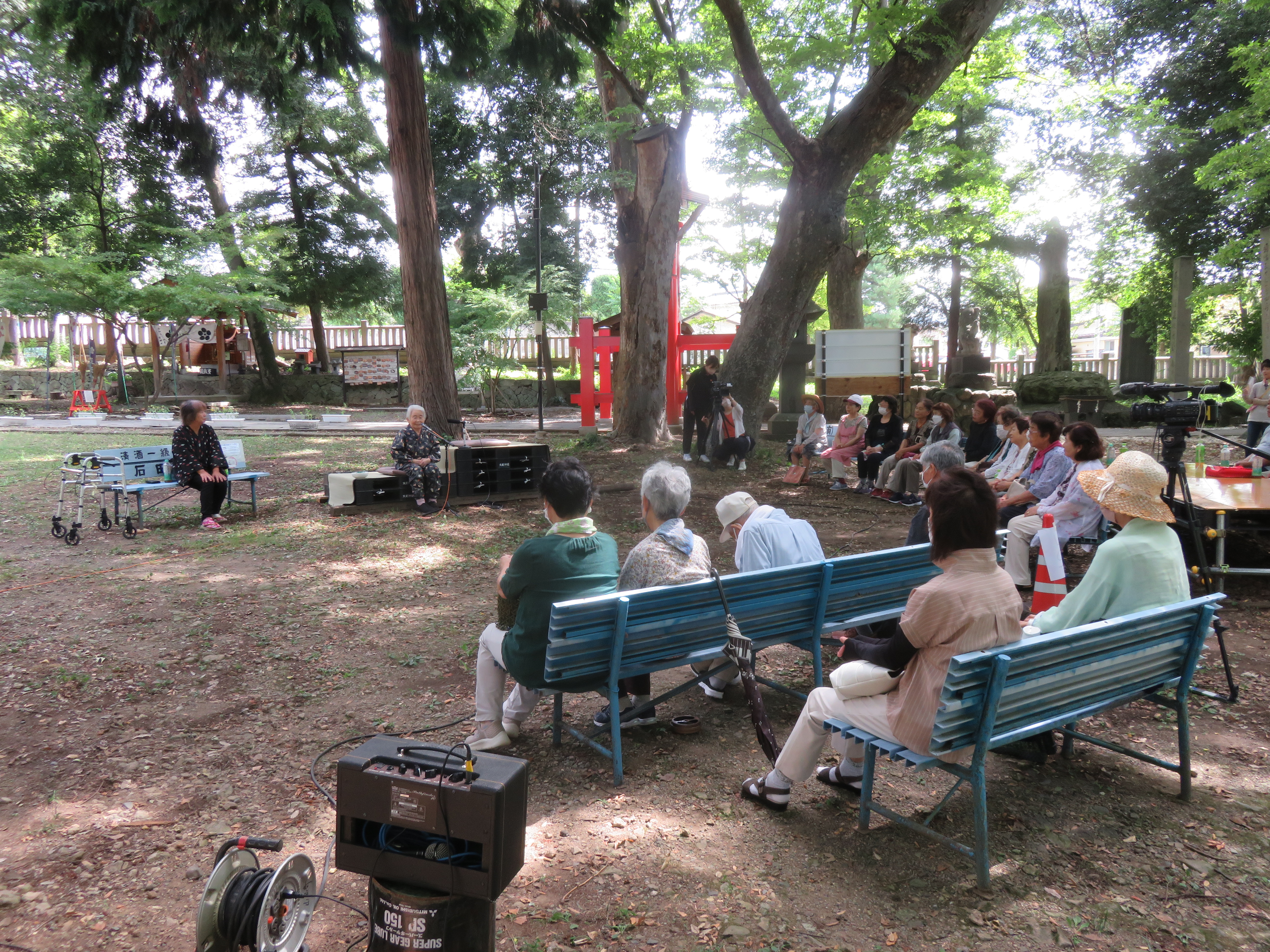 40名近い観客の皆さんにお出でいただいて大入り満員となり、民俗資料館の囲炉裏前の土間に16名、板塀内側に10名に座っていただいたほか、板塀外のフロアにモニター席を設けて映像で視聴していただきました。